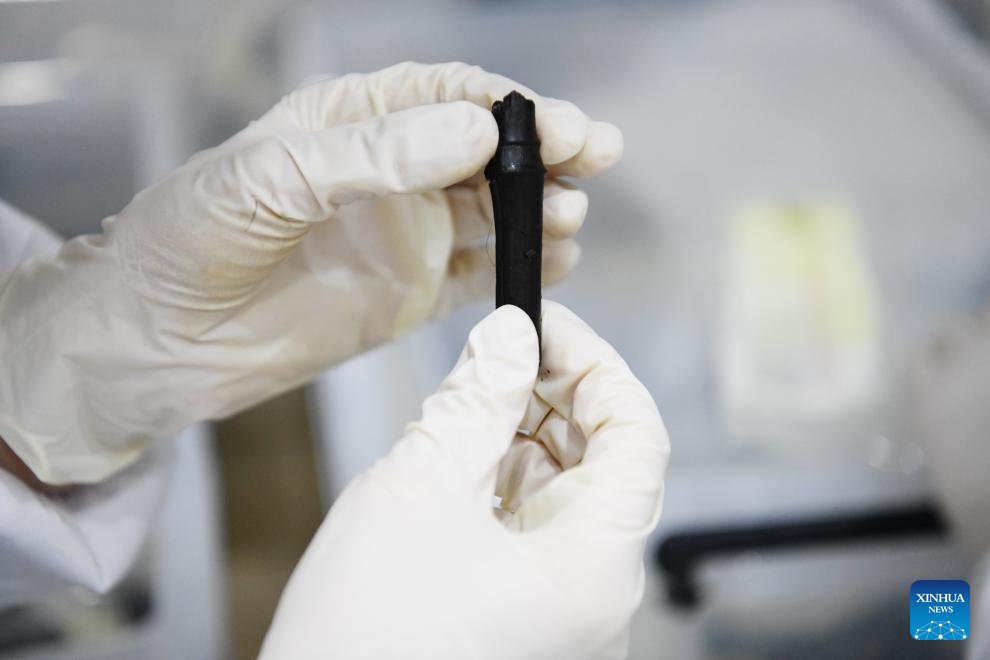 An archaeologist shows a relic unearthed from the Wuwangdun tomb discovered in Huainan, east China's Anhui Province, May 20, 2024. (Xinhua/Zhang Duan)