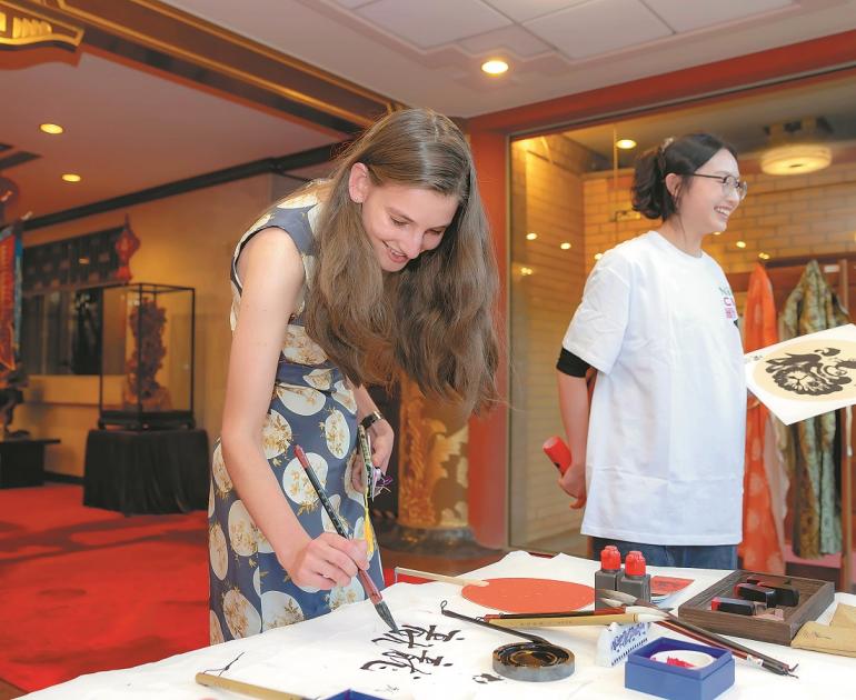 A guest tries Chinese calligraphy while attending the China Culture Day. (CHU CHEN/XINHUA)