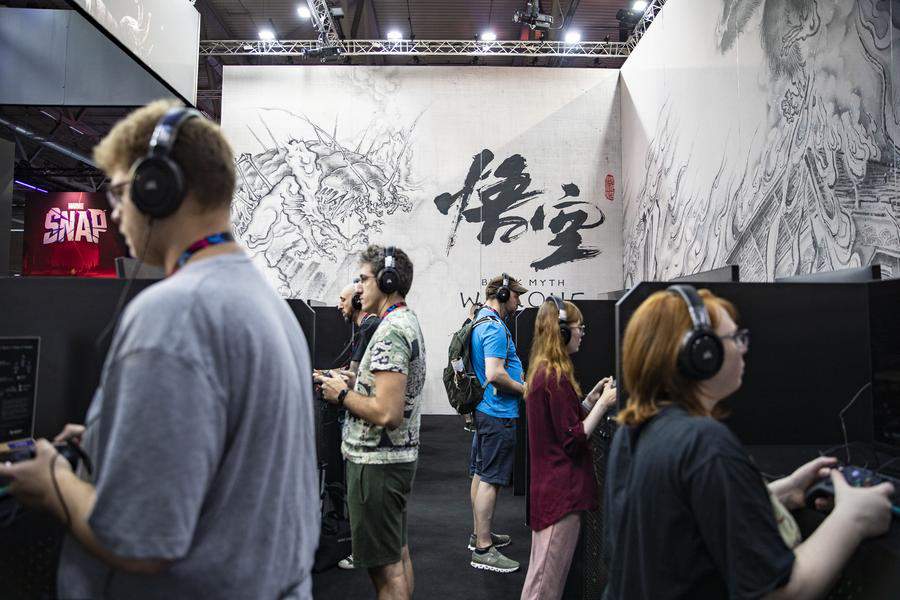 People try "Black Myth: Wukong" at the booth of Game Science during Gamescom 2023 in Cologne, Germany, Aug. 23, 2023. (Xinhua/Zhang Fan)