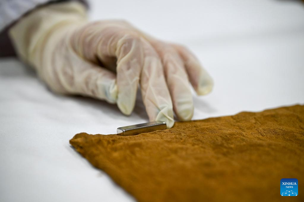 Suzhou Silk Museum staff member Chen Yanlu uses a magnet to flatten a silk cultural clothing against an iron workbench in Suzhou, east China's Jiangsu Province, May 18, 2025. (Xinhua/Li Bo)