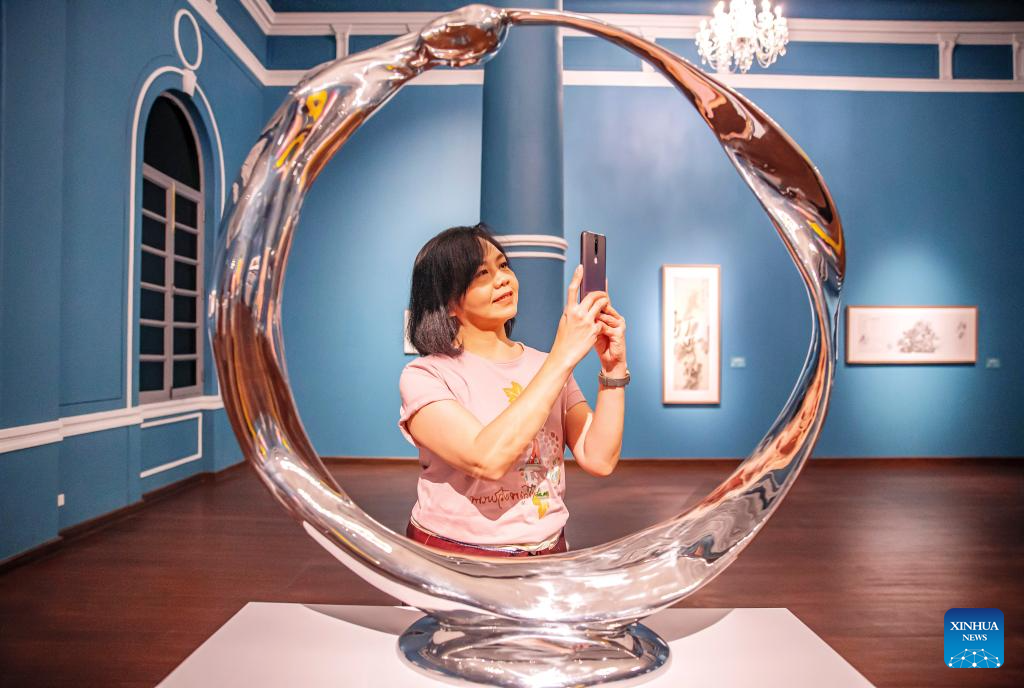 A visitor takes photos of a sculpture during an exhibition featuring artworks from China at the National Gallery of Thailand, in Bangkok, Thailand, Dec. 27, 2023. The exhibition brings together 63 artworks by 42 Chinese artists. (Xinhua/Wang Teng)