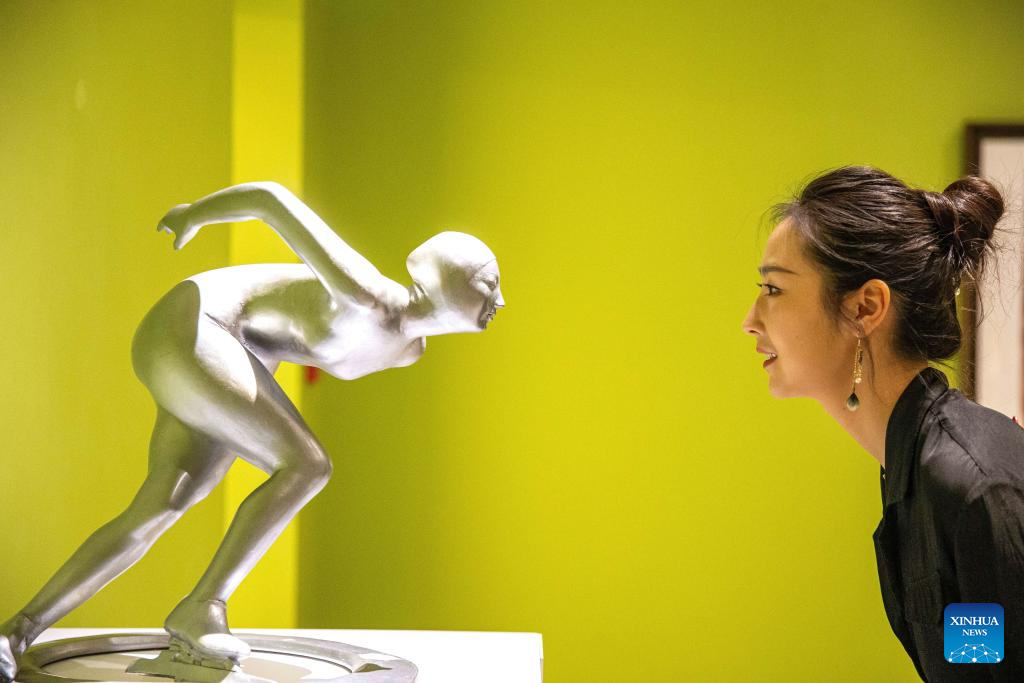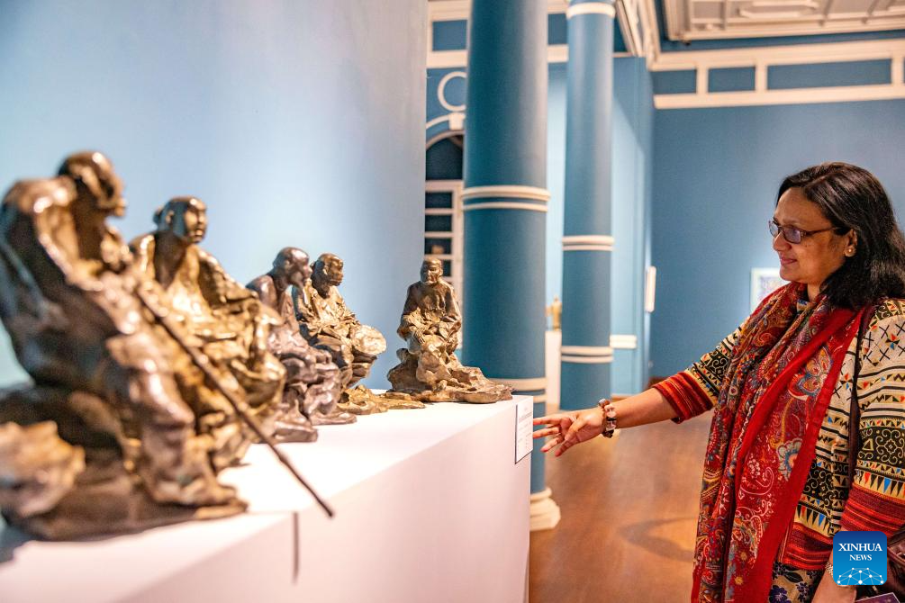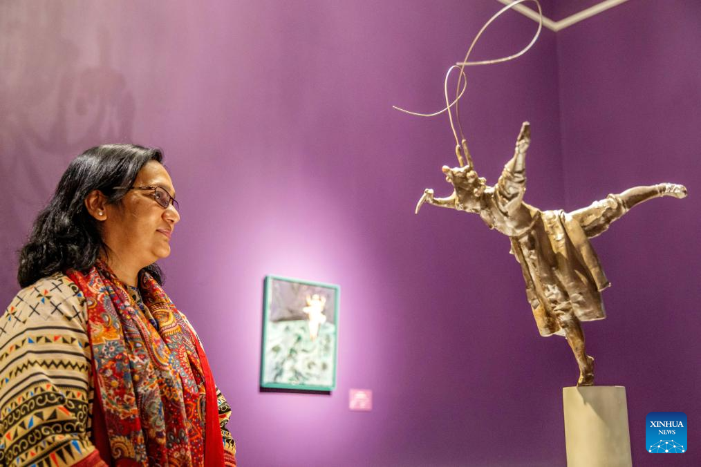A visitor views a sculpture during an exhibition featuring artworks from China at the National Gallery of Thailand, in Bangkok, Thailand, Dec. 27, 2023. The exhibition brings together 63 artworks by 42 Chinese artists. (Xinhua/Wang Teng)