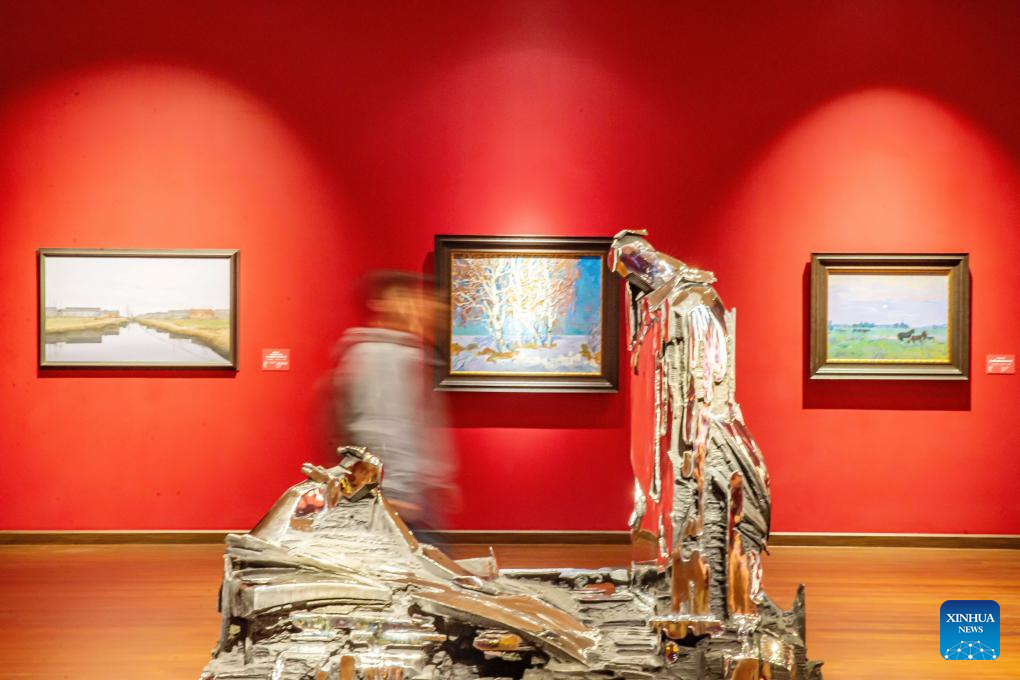 A visitor walks past an exhibit during an exhibition featuring artworks from China at the National Gallery of Thailand, in Bangkok, Thailand, Dec. 27, 2023. The exhibition brings together 63 artworks by 42 Chinese artists. (Xinhua/Wang Teng)