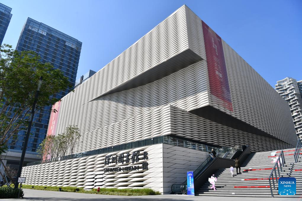 This photo taken on Dec. 28, 2023 shows an exterior view of the north hall of Shenzhen Library in Shenzhen, south China's Guangdong Province. Located in Longhua District of the city, the north hall of Shenzhen Library officially opened on Thursday. With a building area of about 72,000 square meters, the hall is designed to stock 8 million books and provides 2,500 seats. (Xinhua/Liang Xu)