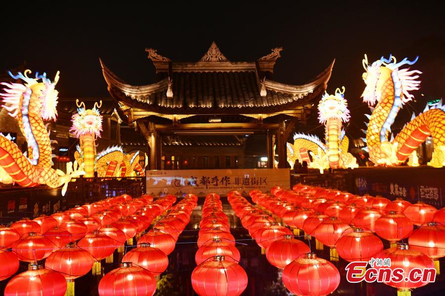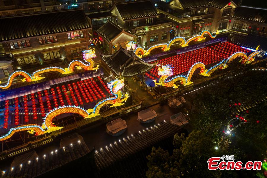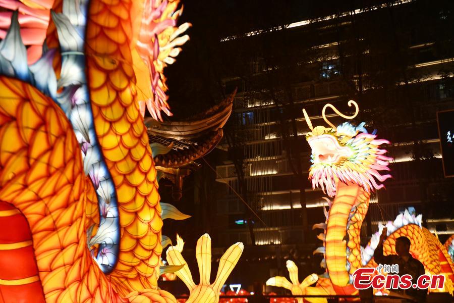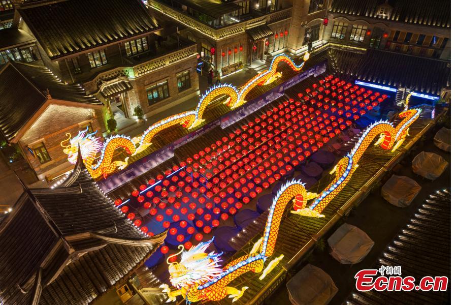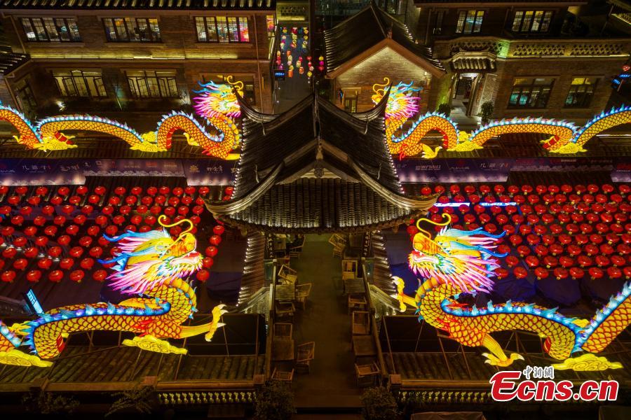 Four sets of Loong-themed lanterns shine over roof top of Dongmen street in Chengdu, southwest China's Sichuan Province, Jan. 13, 2024. (Photo: China News Service/Zhang Lang)