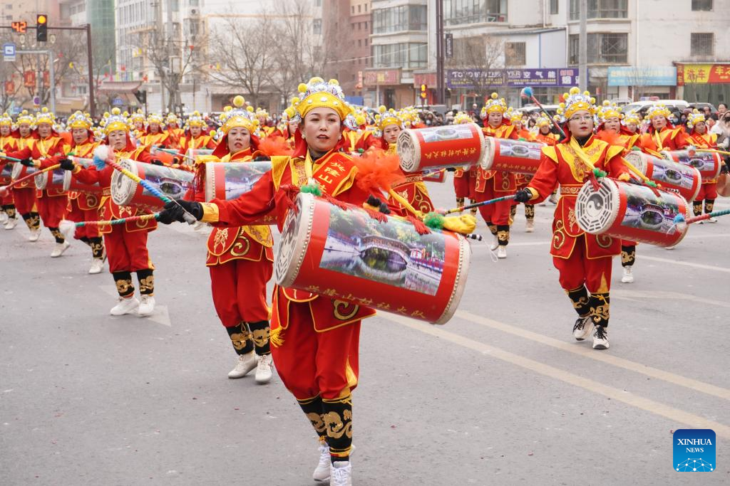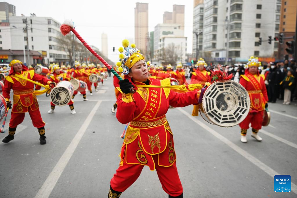 Performers play drums during a Shehuo show in Yuzhong County of Lanzhou, northwest China's Gansu Province, Feb. 20, 2024. Shehuo, a traditional folk celebration in China, is a festivity in multiple forms consisting of dragon dance, lion dance, traditional Chinese opera, drum playing and other folk performances that may vary in different regions. (Xinhua/Ma Xiping)