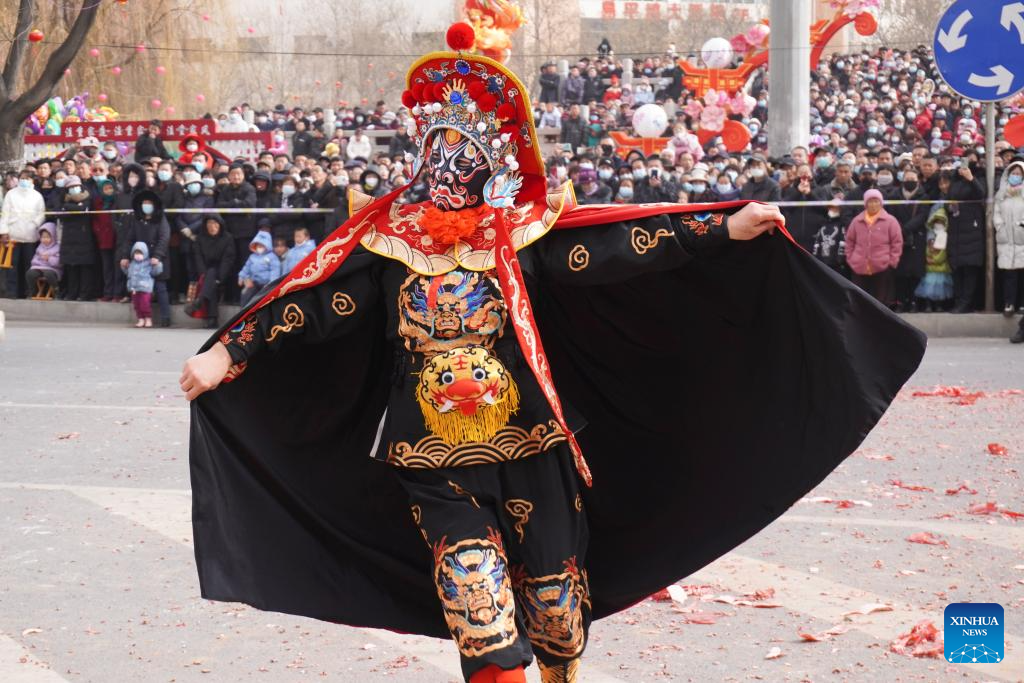 An actor performs traditional opera during a Shehuo show in Yuzhong County of Lanzhou, northwest China's Gansu Province, Feb. 20, 2024. Shehuo, a traditional folk celebration in China, is a festivity in multiple forms consisting of dragon dance, lion dance, traditional Chinese opera, drum playing and other folk performances that may vary in different regions. (Xinhua/Ma Xiping)