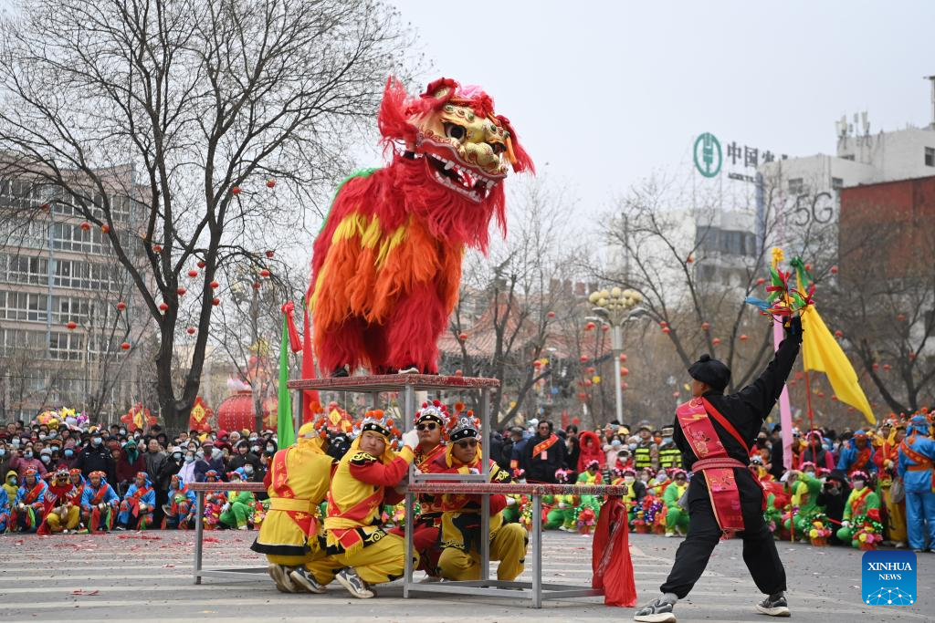 Performers perform lion dance during a Shehuo show in Yuzhong County of Lanzhou, northwest China's Gansu Province, Feb. 20, 2024. Shehuo, a traditional folk celebration in China, is a festivity in multiple forms consisting of dragon dance, lion dance, traditional Chinese opera, drum playing and other folk performances that may vary in different regions. (Xinhua/Ma Xiping)