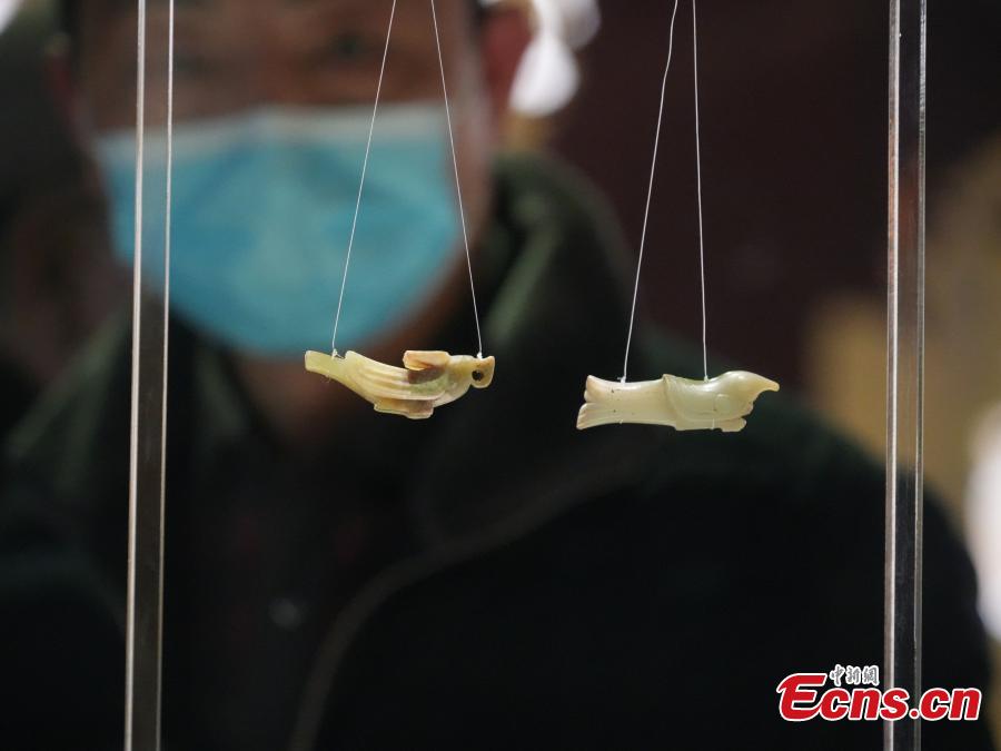 Jade birds of the Shang Dynasty(1600 B.C.-1046 B.C.) are displayed at the new Yinxu museum in Anyang, central China's Henan Province, Feb. 26, 2024. (Photo: China News Service/Li Chaoqing)