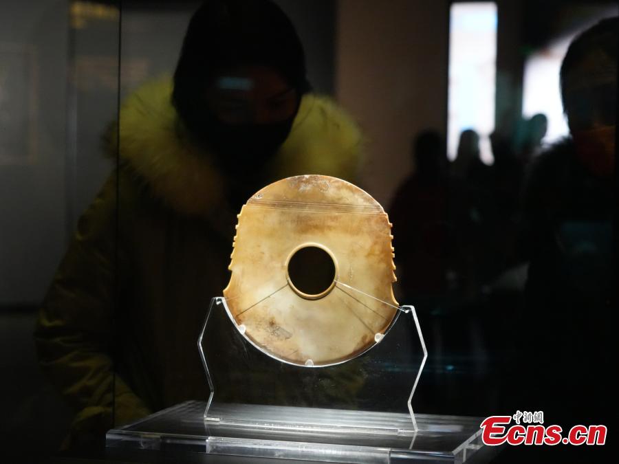 An archaic calcified jade notched axe, Qi of the Shang dynasty (1600 B.C.-1046 B.C.) is displayed at the new Yinxu museum in Anyang, central China's Henan Province, Feb. 26, 2024. (Photo: China News Service/Li Chaoqing)