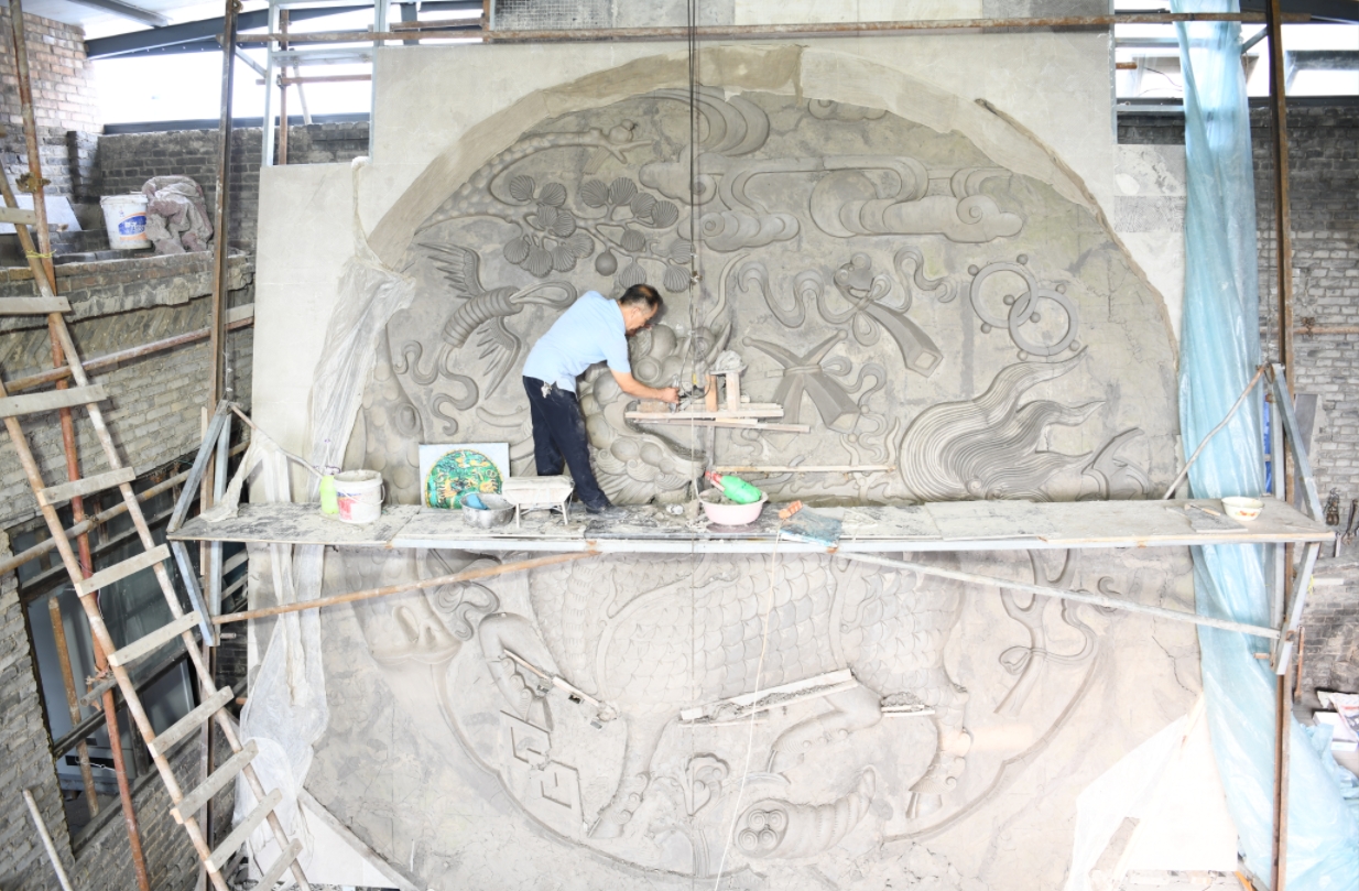 Liu Kaibao crafts a colored glaze piece, which stands 6.18 meters tall. (Photo courtesy of the interviewee)