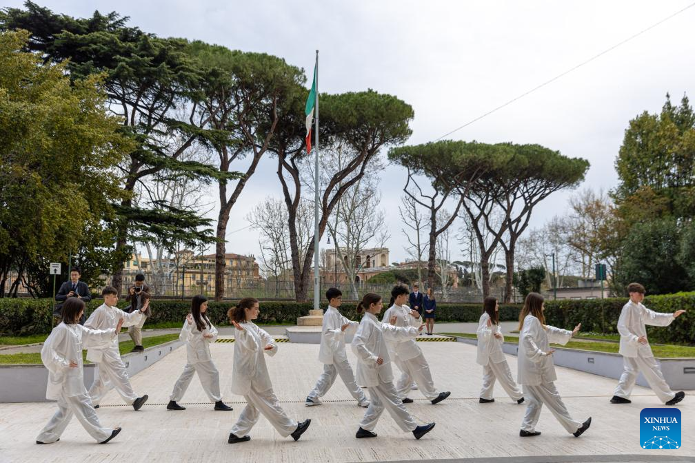 Students of Rome Convitto Nazionale Vittorio Emanuele II perform Taichi in Rome, Italy, March 25, 2024. Students in Rome Convitto Nazionale Vittorio Emanuele II attended a Chinese show on Monday to demonstrate their learning outcomes of Chinese language via diverse performances. (Xinhua/Li Jing)