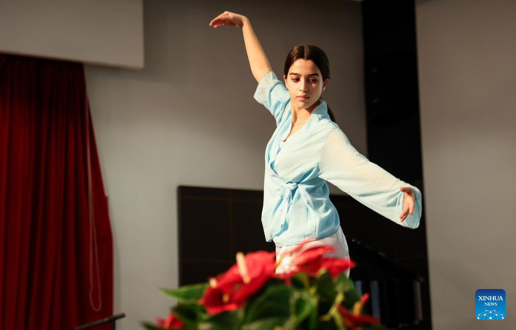 A student of Rome Convitto Nazionale Vittorio Emanuele II performs a Chinese folk dance in Rome, Italy, March 25, 2024. Students in Rome Convitto Nazionale Vittorio Emanuele II attended a Chinese show on Monday to demonstrate their learning outcomes of Chinese language via diverse performances. (Xinhua/Li Jing)