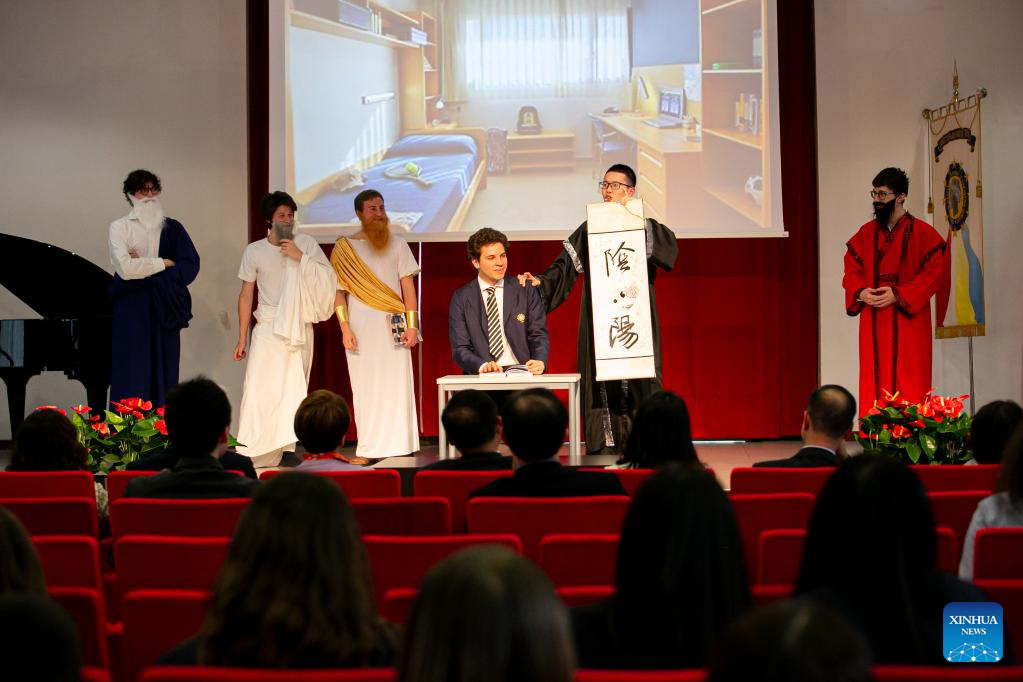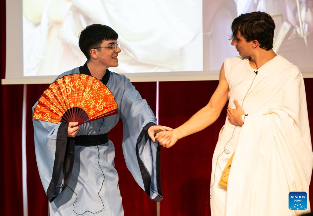 Students of Rome Convitto Nazionale Vittorio Emanuele II perform a drama in Chinese in Rome, Italy, March 25, 2024. Students in Rome Convitto Nazionale Vittorio Emanuele II attended a Chinese show on Monday to demonstrate their learning outcomes of Chinese language via diverse performances. (Xinhua/Li Jing)