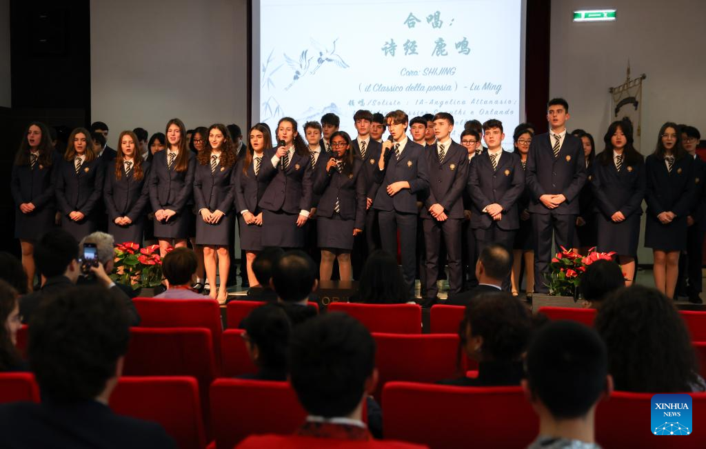 Students of Rome Convitto Nazionale Vittorio Emanuele II perform a chorus in Rome, Italy, March 25, 2024. Students in Rome Convitto Nazionale Vittorio Emanuele II attended a Chinese show on Monday to demonstrate their learning outcomes of Chinese language via diverse performances. (Xinhua/Li Jing)