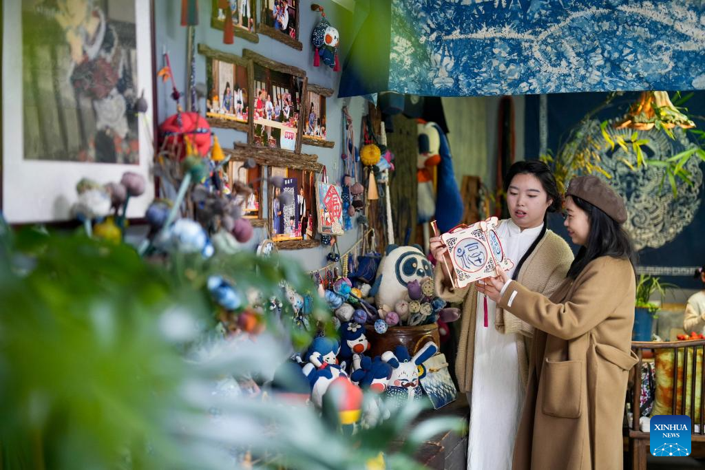 Li Sa (L) introduces a batik product to a customer at her studio in Tangshan, north China's Hebei Province, April 6, 2024.(Xinhua/Mu Yu)