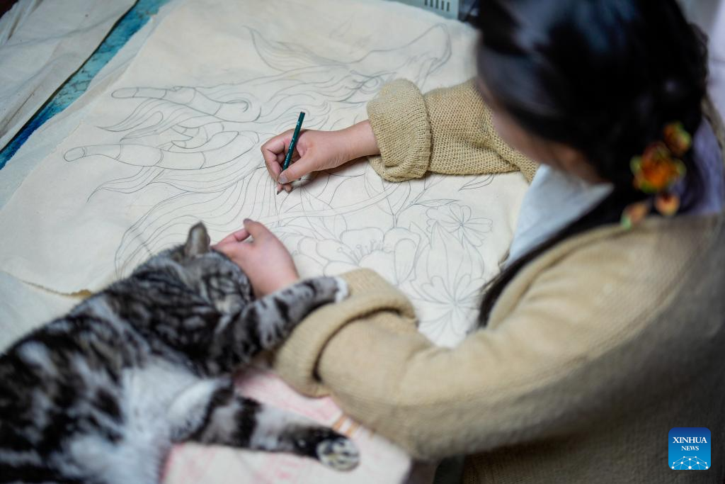 Li Sa draws a pattern for batik products in Tangshan, north China's Hebei Province, April 6, 2024.(Xinhua/Mu Yu)