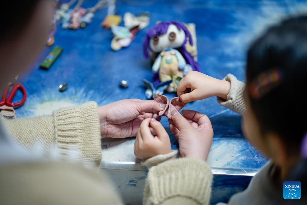 Li Sa (L) teaches a young learner to make batik product at her studio in Tangshan, north China's Hebei Province, April 6, 2024.(Xinhua/Mu Yu)