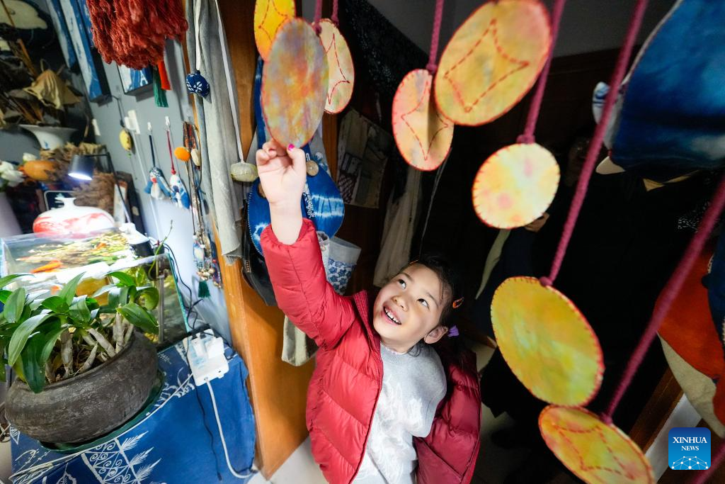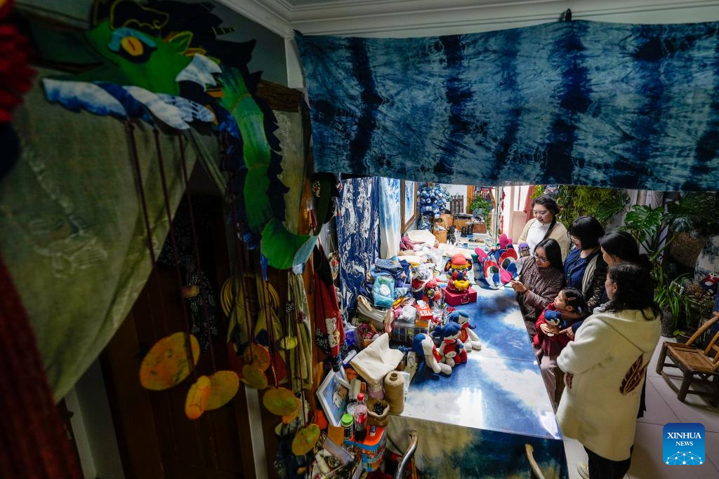 A young learner views batik products at Li Sa's studio in Tangshan, north China's Hebei Province, April 6, 2024.(Xinhua/Mu Yu)
