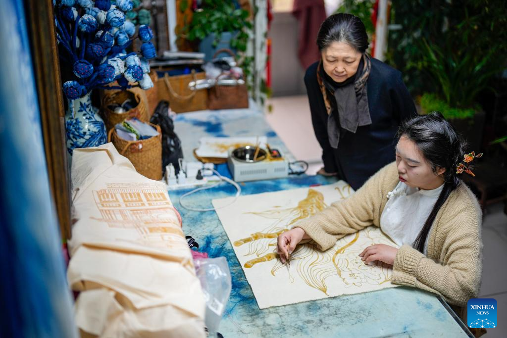 Li Sa (R) demonstrates the batik technique at her studio in Tangshan, north China's Hebei Province, April 6, 2024.(Xinhua/Mu Yu)
