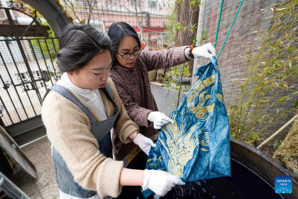 Li Sa (L) and her mother Gan Caiyun make batik cloth in Tangshan, north China's Hebei Province, April 6, 2024.(Xinhua/Mu Yu)
