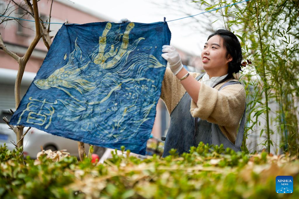 Li Sa smooths out batik cloth in Tangshan, north China's Hebei Province, April 6, 2024.(Xinhua/Mu Yu)