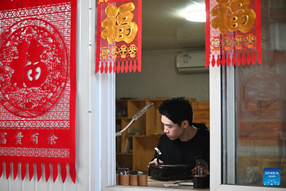 Ma Sai makes a filigree mosaic artwork at his studio in Liuzhuang Village of Wuqing District of Tianjin, north China, March 19, 2024. (Xinhua/Zhao Zishuo)