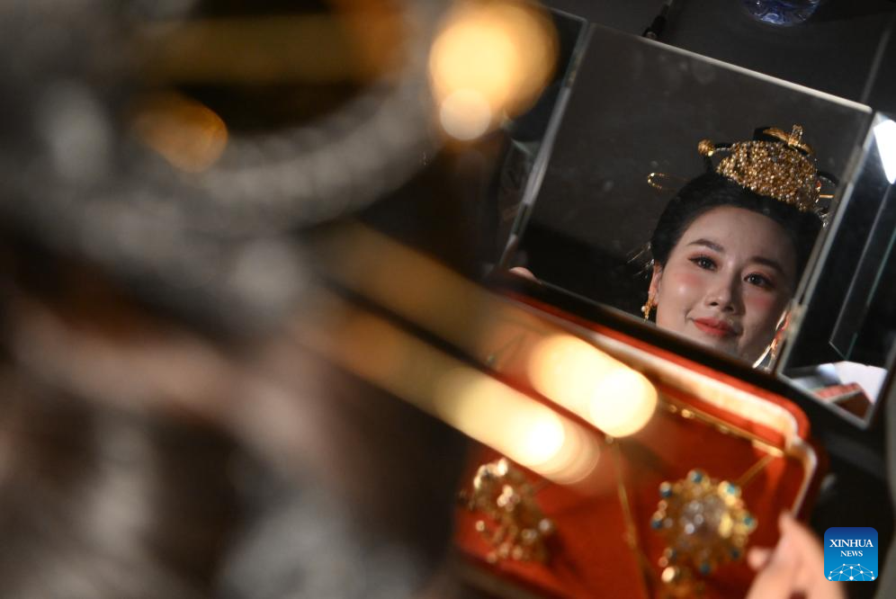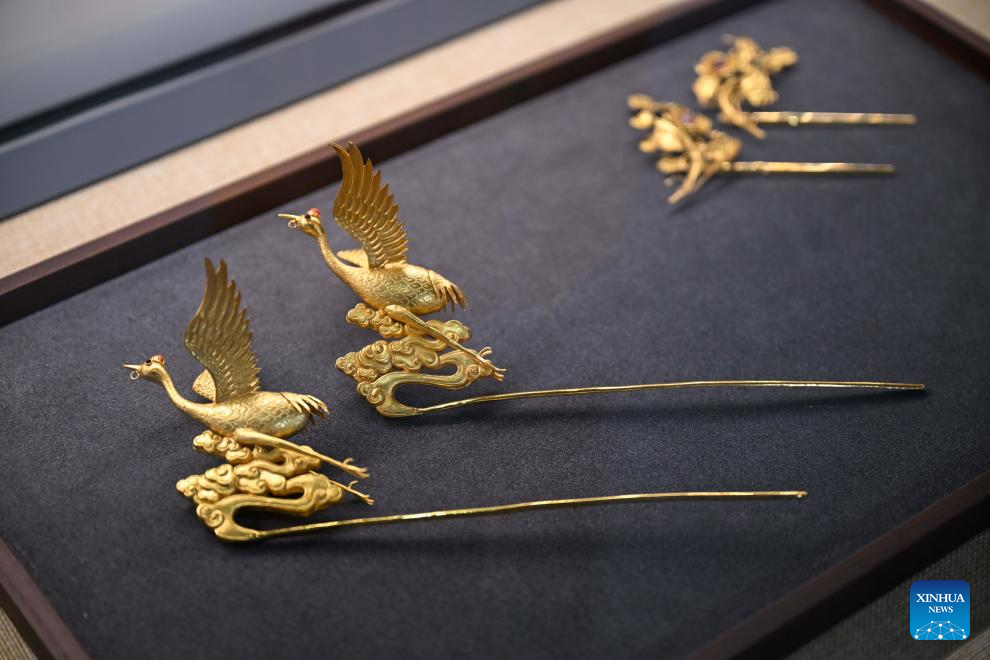 An enthusiast for Hanfu tries a head decoration of filigree mosaic at a studio in Tianjin, north China, March 7, 2024. (Xinhua/Sun Fanyue)