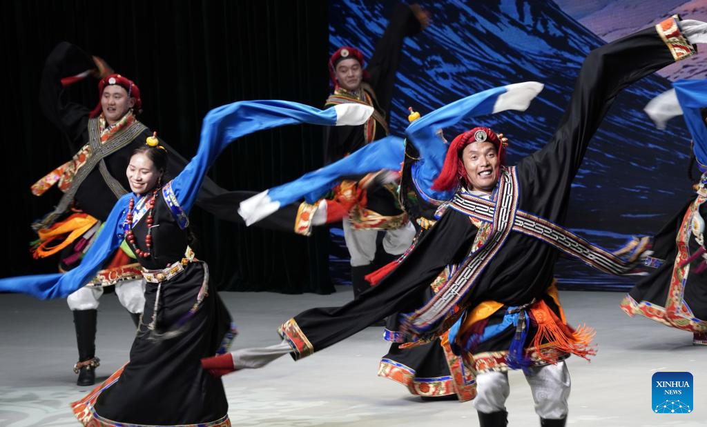 Actors from Yushu Tibetan Autonomous Prefecture of northwest China's Qinghai Province perform in Beijing, capital of China on May 13, 2024. Thirty actors, all of them career farmers and herders, presented 10 shows, including dance, chorus and short plays here on Monday night. (Xinhua/Li Xin)