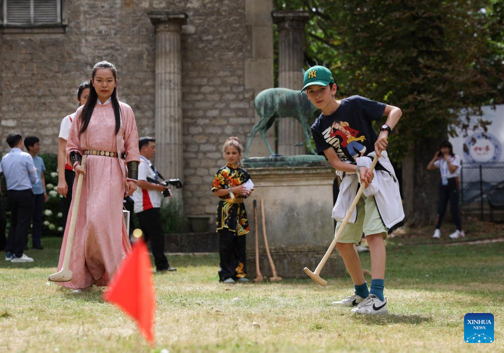 A child experiences Chuiwan game in the China House for the Paris 2024 Olympic Games in Paris, France, on Aug. 3, 2024. (Xinhua/Hu Xingyu)
