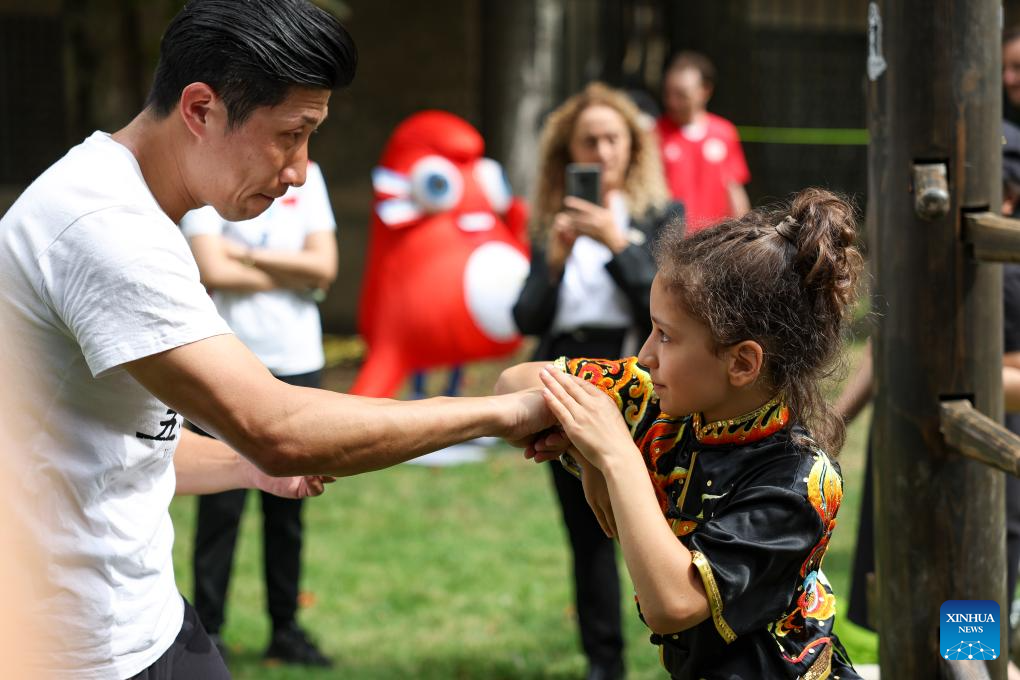 A child experiences Wing Chun in the China House for the Paris 2024 Olympic Games in Paris, France, on Aug. 3, 2024. (Xinhua/Hu Xingyu)