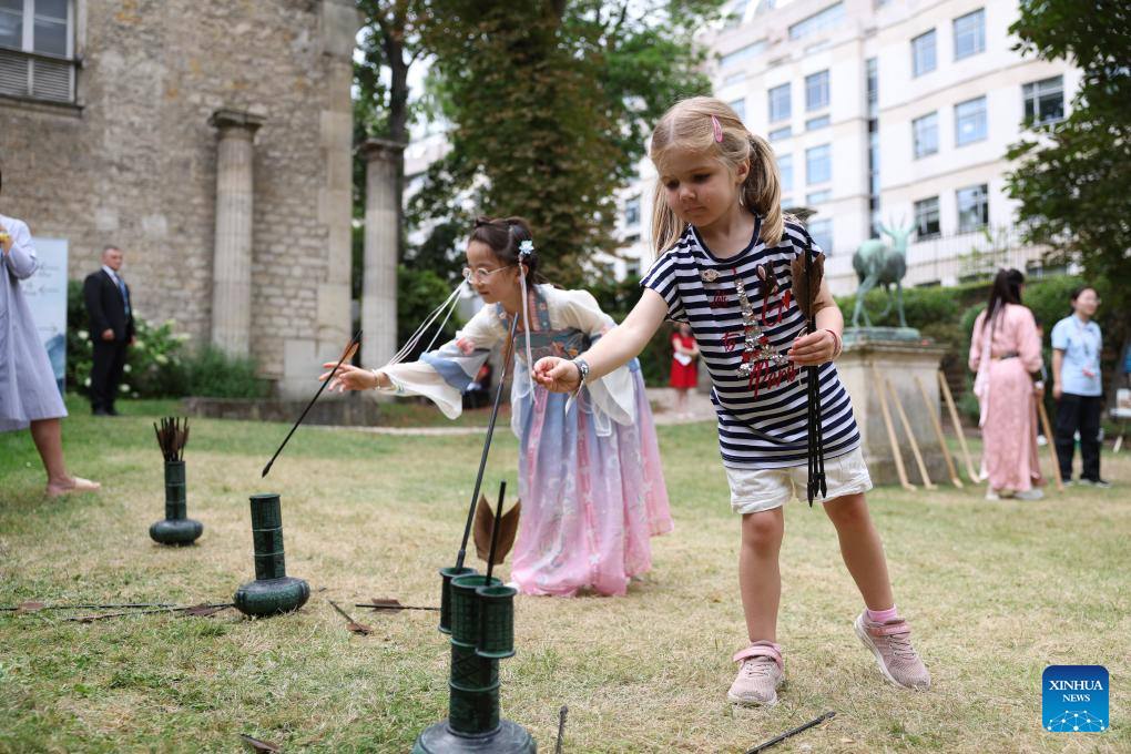 A child experiences Touhu game, or pitch-pot, an ancient entertainment that requires players to throw arrows from a set distance into a pot, in the China House for the Paris 2024 Olympic Games in Paris, France, on Aug. 3, 2024. (Xinhua/Hu Xingyu)
