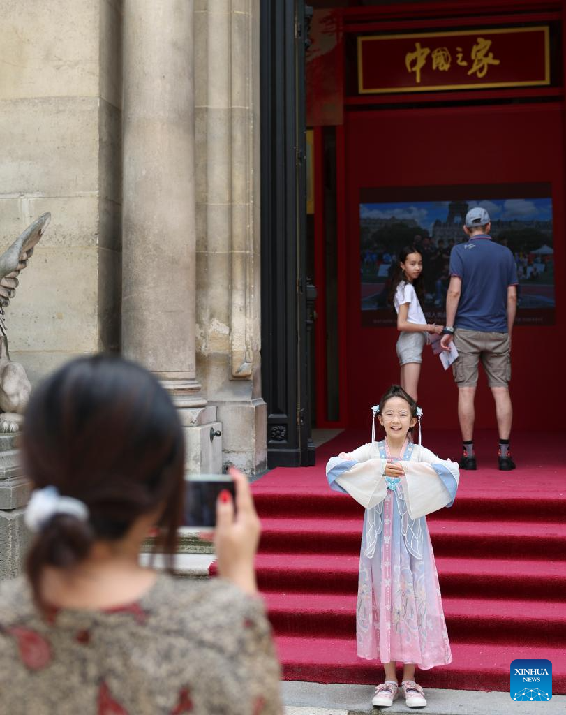 A child poses for photos in the China House for the Paris 2024 Olympic Games in Paris, France, on Aug. 3, 2024. (Xinhua/Hu Xingyu)