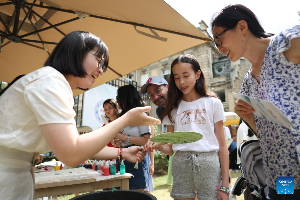 A child experiences lacquer fans in the China House for the Paris 2024 Olympic Games in Paris, France, on Aug. 3, 2024. (Xinhua/Hu Xingyu)