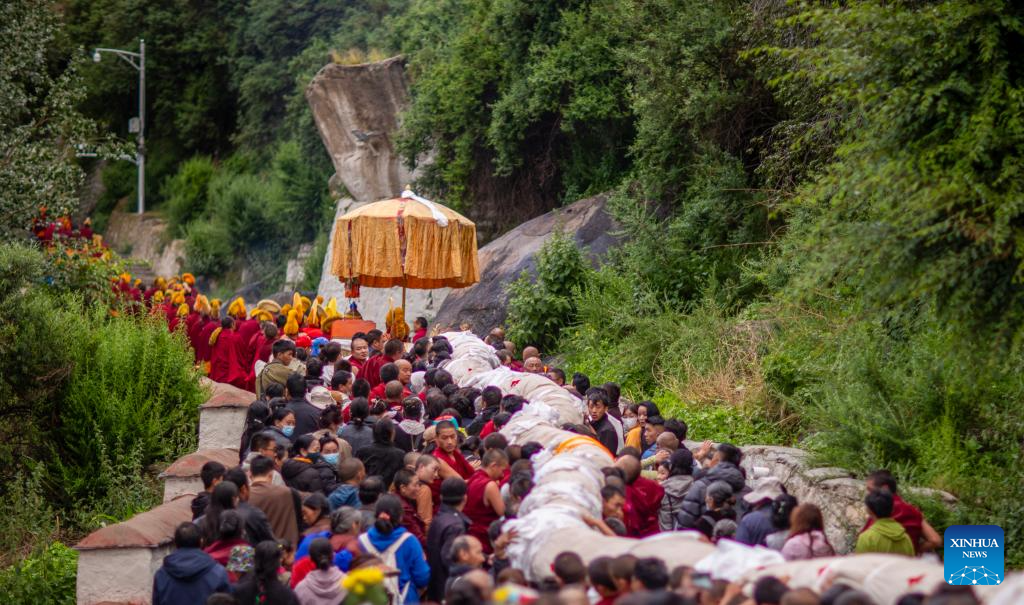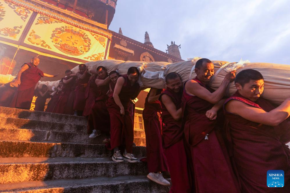 Monks carry an enormous rolled-up thangka painting of Buddha at the Drepung Monastery in Lhasa, southwest China's Xizang Autonomous Region, Aug. 4, 2024. Celebrations marking the traditional Shoton Festival, or Yogurt Festival, began in Lhasa, capital of southwest China's Xizang Autonomous Region, on Sunday. (Xinhua/Jiang Fan)