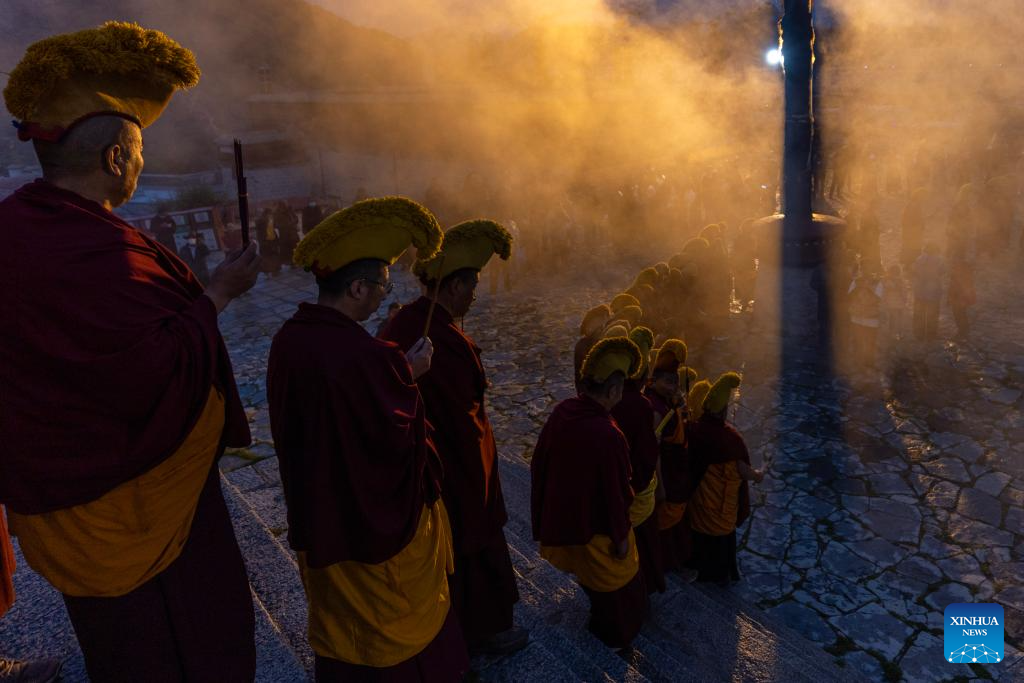 Monks walk out of a hall at the Drepung Monastery in Lhasa, southwest China's Xizang Autonomous Region, Aug. 4, 2024. Celebrations marking the traditional Shoton Festival, or Yogurt Festival, began in Lhasa, capital of southwest China's Xizang Autonomous Region, on Sunday. (Xinhua/Jiang Fan)
