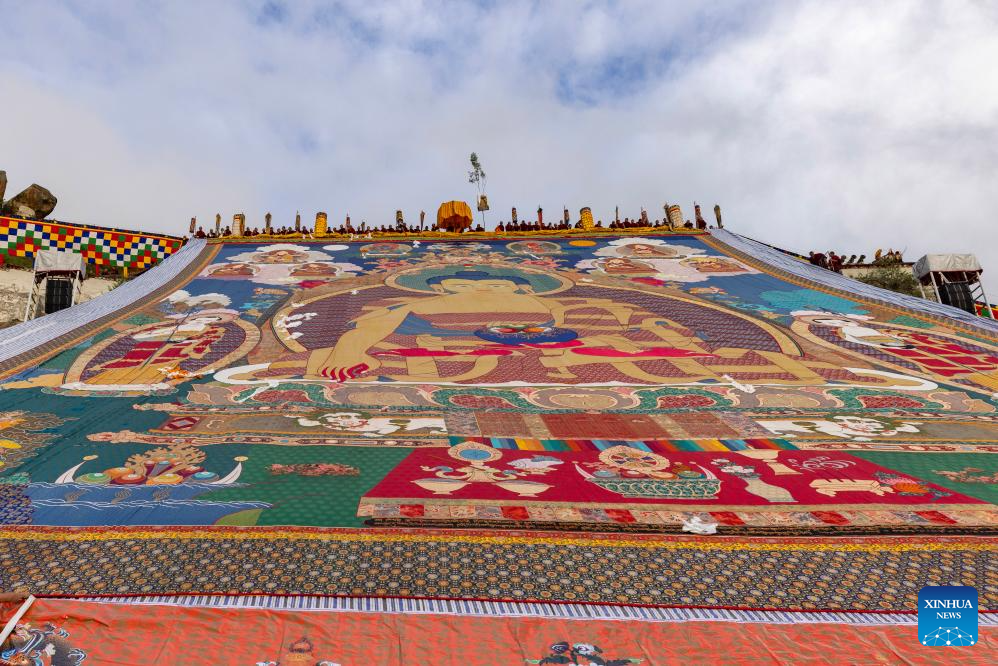 An enormous thangka painting of Buddha is unrolled on a platform on the hillside for sunning in Lhasa, southwest China's Xizang Autonomous Region, Aug. 4, 2024. Celebrations marking the traditional Shoton Festival, or Yogurt Festival, began in Lhasa, capital of southwest China's Xizang Autonomous Region, on Sunday. (Xinhua/Jiang Fan)