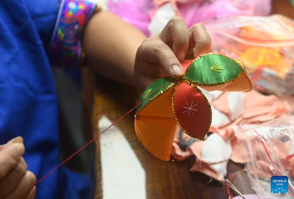 A resident makes an embroidered ball in Xinjing Township of Jingxi City, south China's Guangxi Zhuang Autonomous Region, Aug. 27, 2024. Embroidered balls from Jingxi are well received nationwide due to their exquisite design and craftsmanship, which are uaually stuffed with spices or herbal medicines. (Xinhua/Lu Boan)