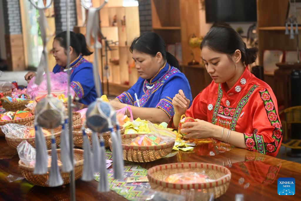 Locals make embroidered balls in Xinjing Township of Jingxi City, south China's Guangxi Zhuang Autonomous Region, Aug. 27, 2024. Embroidered balls from Jingxi are well received nationwide due to their exquisite design and craftsmanship, which are uaually stuffed with spices or herbal medicines. (Xinhua/Lu Boan)
