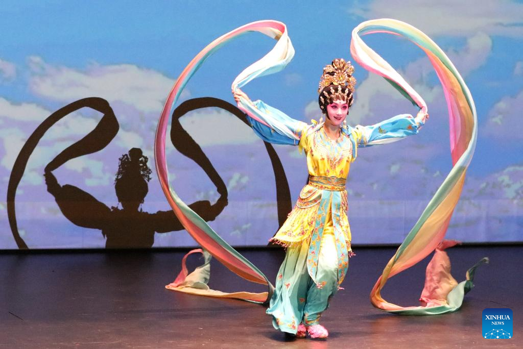 An opera artist from south China's Guangdong Province presents a performance showcasing the charm of China's Lingnan culture at the National Museum of New Zealand in Wellington, New Zealand, Sept. 25, 2024. This cultural promotion event was jointly held by the China International Cultural Association, the Chinese Embassy in New Zealand, the Guangdong Provincial Department of Culture and Tourism, the China Cultural Center in Wellington, and co-organized by the Federation of the Chinese Association of New Zealand. It aims to promote exchanges and mutual learning of civilizations between China and New Zealand. (Photo by Meng Tao/Xinhua)