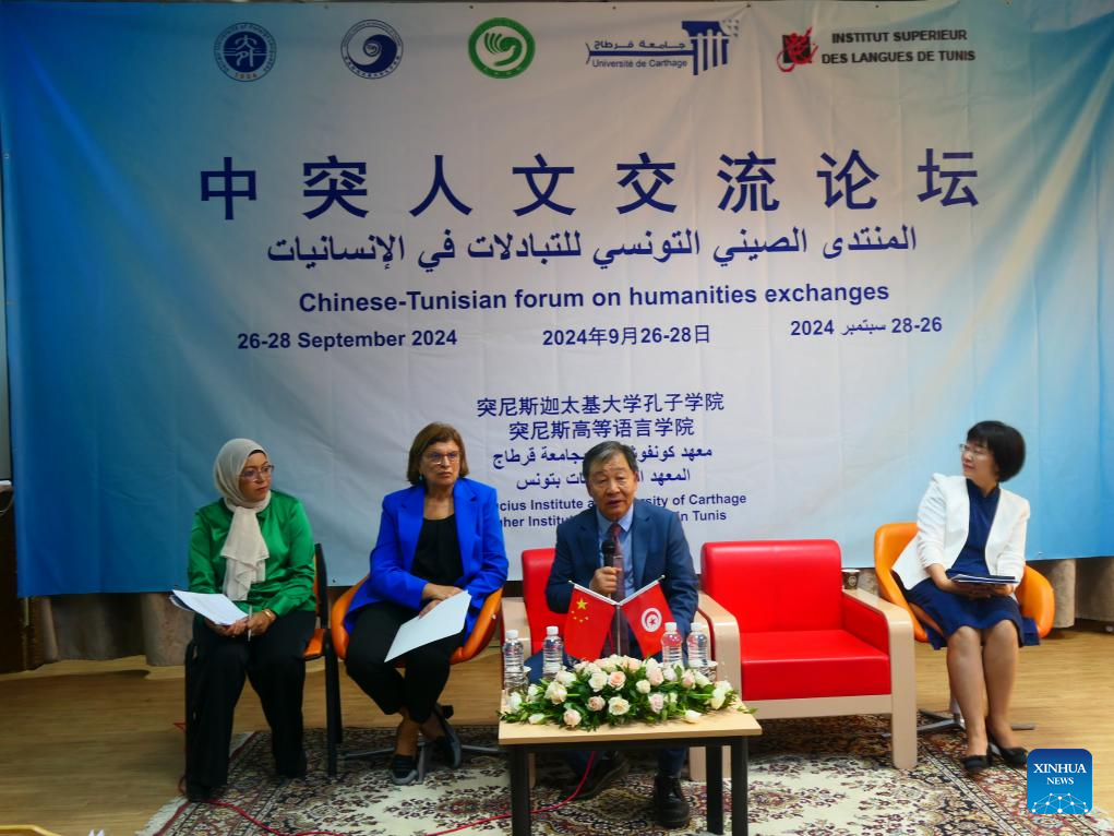 Scholars from China and Tunisia attend a forum in Tunis, Tunisia, on Sept. 26, 2024. The Chinese-Tunisian Forum on Humanities Exchanges kicked off here on Thursday, focusing on cultural cooperation and exchanges. (Xinhua/Huang Ling)
