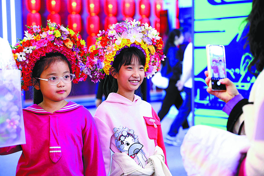 Young women and girls gathered at Huang Liyong's booth during the expo as she arranged polychromatic flowers for a headdress that is part of the women's customs from Xunpu, a coastal village in Quanzhou, Southeast China's Fujian province.