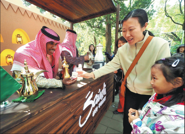 Visitors taste Saudi coffee during the Saudi Tourism Festival at the Temple of Heaven Park in Beijing on Oct 21. The festival, held from Oct 18 to 26, featured interactive booths and live performances. (DU JIANPO/FOR CHINA DAILY)