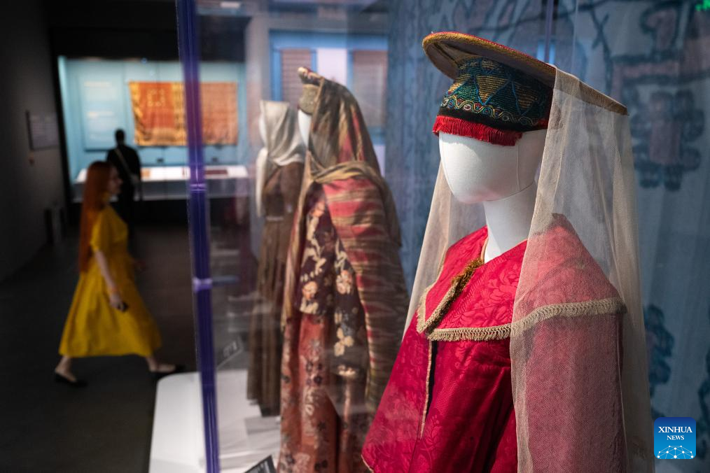 A visitor views exhibits during an exhibition titled "Cocoon of Traditions: Silk in the National Cultures of Eurasia" at Hubei Provincial Museum in Wuhan, central China's Hubei Province, Nov. 22, 2024. The exhibition, which opened here on Nov. 22, showcases 283 pieces of silk textiles dating back from the 19th century to the first half of the 20th century from the Russian Museum of Ethnography. (Xinhua/Xiao Yijiu)