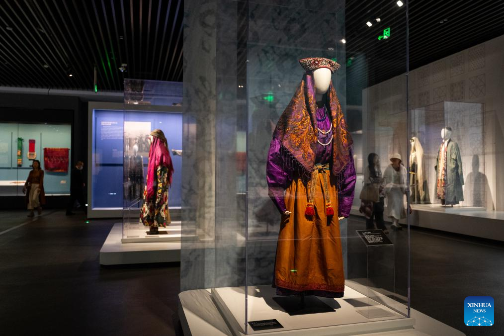People visit an exhibition titled "Cocoon of Traditions: Silk in the National Cultures of Eurasia" at Hubei Provincial Museum in Wuhan, central China's Hubei Province, Nov. 22, 2024. The exhibition, which opened here on Nov. 22, showcases 283 pieces of silk textiles dating back from the 19th century to the first half of the 20th century from the Russian Museum of Ethnography. (Xinhua/Xiao Yijiu)