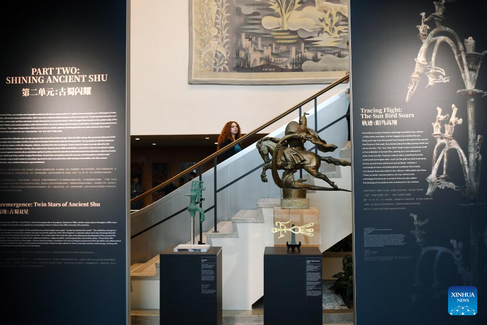 Themed "Light of the Sun -- Ancient Shu Civilization and the World," the exhibition draws on artifacts and motifs from the renowned Sanxingdui and Jinsha archaeological sites in southwest China, which date back approximately 3,600 to 2,800 years. (Photo by Lu Xiaonan/Xinhua)