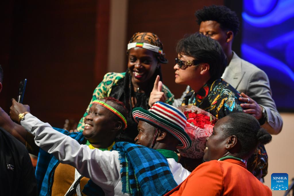 Ethiopian and Chinese artists take a selfie in Addis Ababa, the capital of Ethiopia, on July 13, 2025. A troupe of artists from Inner Mongolia, an autonomous region in north China, presented a performance of traditional and contemporary songs and dances in Addis Ababa, the capital of Ethiopia, on Sunday evening. (Xinhua/Michael Tewelde)