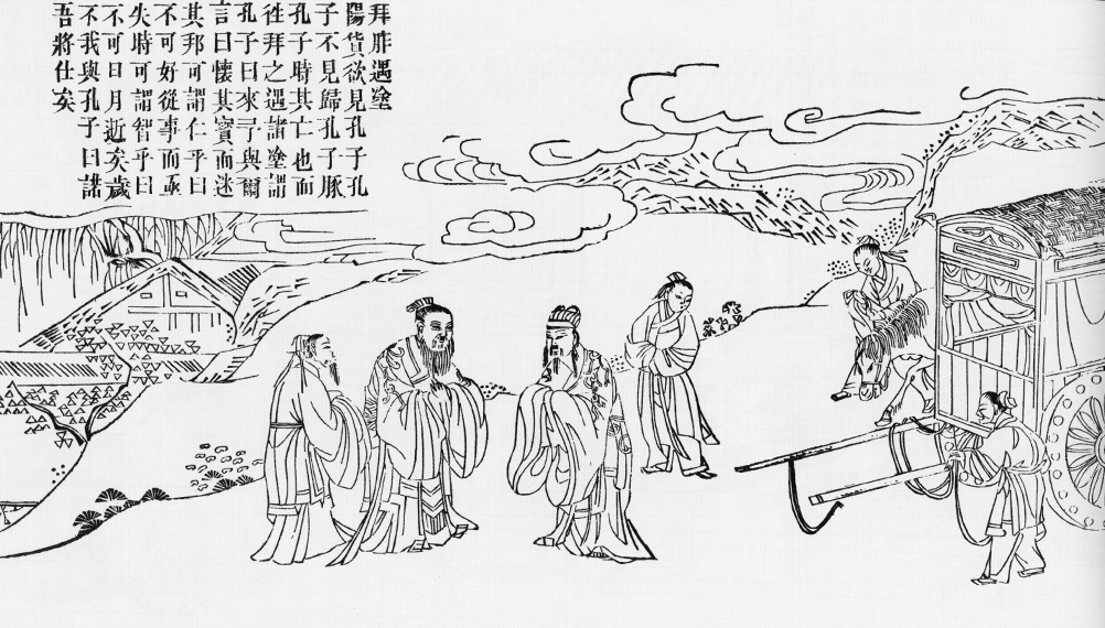 In 501 BC, Yang Hu, a retainer of Lord Ji, tried to draw in Confucius, but Confucius refused to see him. So Yang Hu sent someone to send a steamed pig to Confucius while he was not at home. Because according to the etiquette at that time, if he gave something to Confucius, Confucius should go to visit him to show respect. Yang Hu expected that Confucius would come to his house to thank him, so he could have a deep conversation with him. However, Confucius also went to Yang Hu's house when he was not at home. It happened that Confucius met Yang Hu on his way home. He wanted to avoid it, but Yang Hu stopped him and asked, "Is it benevolent to let the country be in chaos when you have unique skills?" Confucius replied, "No." Yang Hu then asked, "Is it wise to miss good opportunities when you hope to achieve something?" Confucius said, "No." Finally Yang Hu said, "Time is passing, and opportunities will not come again." Confucius replied, "You're right, I'll find a position that I can hold."