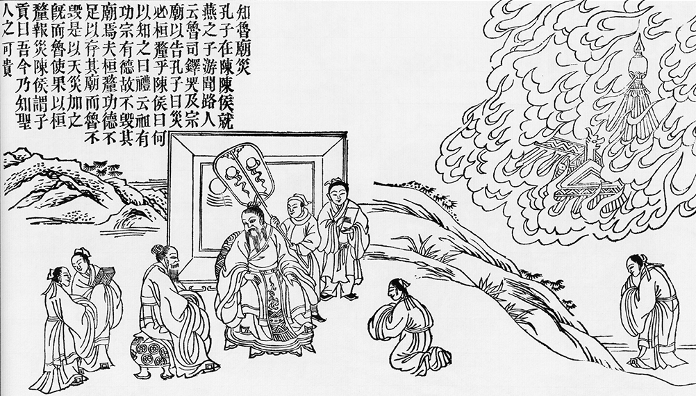 In May of the 3rd year of Duke Ai of Lu state (494 BC), Confucius came to Chen state (its capital is Wanqiu, now Huaiyang of Henan Province). One day, Duke Min of Chen state told Confucius that "the house of Si duo (an official in Lu state which is responsible for the education of the people) in Lu state caught fire and burned the ancestral temple of the state ". Confucius said, "It was probably the ancestral temples of Duke Huan and Duke Xi that was burned." Duke Min asked, "How do you know?" Confucius said, "In terms of rites, if the ancestors had merit and virtue, the ancestral temples would not be destroyed. Duke Huan and Duke Xi now have more than five generations of offspring. Their own merit and virtue were not enough to preserve the ancestral temples, so heaven sent the fire on them." Three days later, an envoy from Lu state came and said that it was the ancestral temples of Duke Huan and Duke Xi that were burned. Duke Min said to Zigong, "Now I know how worthy the master is to be respected." Zigong said, "Rather than praising the master, it's better to entrust him with heavy responsibility and let him use the right way to manage the state!" However, Duke Min didn't put Confucius in important positions.