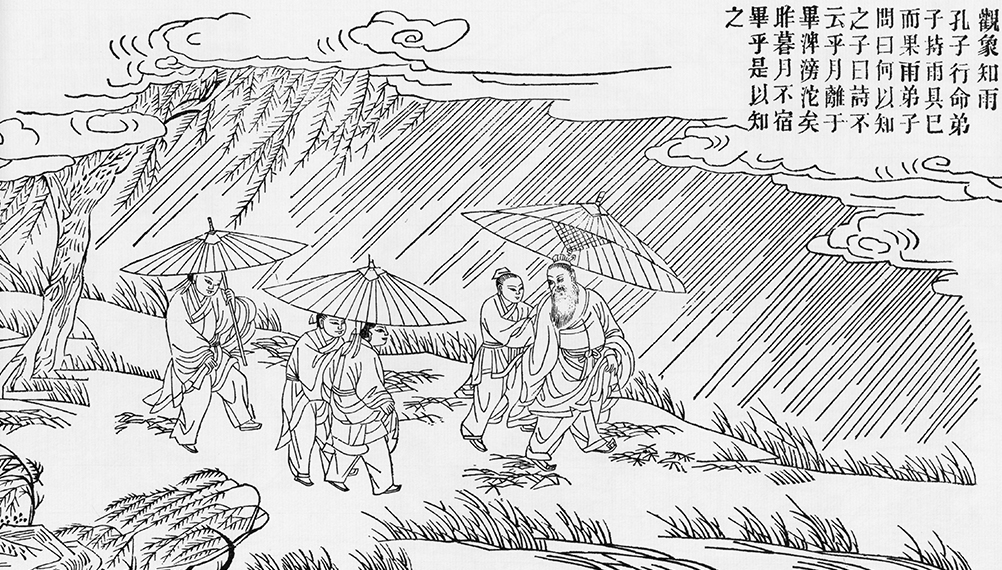 One day, Confucius asked Zilu to prepare rain gear for him as he was going out. It rained heavily as expected after going out. Zilu asked Confucius how he knew it would rain today. Confucius said, "According to one ancient book, if the moon is far from the Bi star (one of the twenty eight stars of the Chinese constellations), it would rain heavily. I watched the stars last night and saw that the moon didn't stop near the Bi star, so I knew it was going to rain." One night a few days later, Zilu saw that the moon and the Bi star were connected by dark clouds. As Confucius was about to go out the next day, Zilu prepared rain gear for him. However, this time Confucius said no, and indeed it didn't rain that day. Zilu was confused and asked Confucius about it. Confucius replied, "That day, the Bi star was on the south side of the moon, so it would rain the next day. But last night, the Bi star was on the north side of the moon, so although there are dark clouds, it would not rain." What Confucius wanted to make Zilu understand is that the same truth would change according to different specific situations.